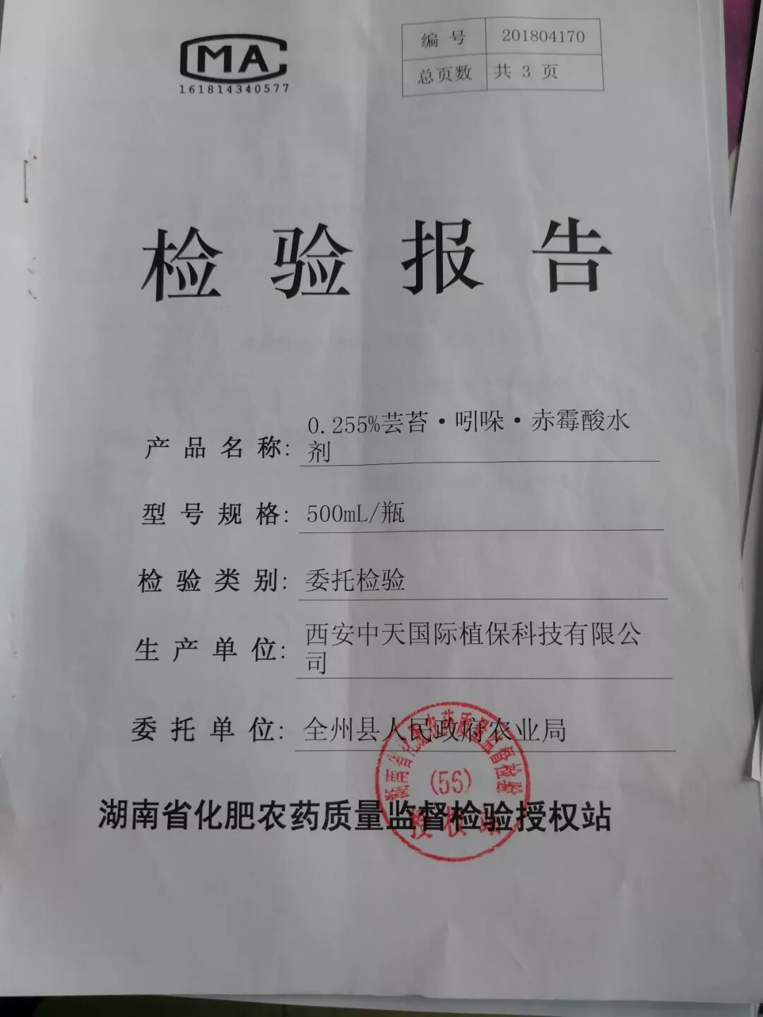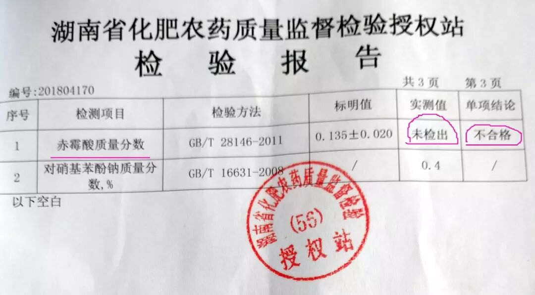 其中“绿佳”牌芸苔•吲哚•赤霉酸水剂中的赤霉酸质量分数竟然“未检出”,也就是说保花保果的药效成分为0。见下图检验报告