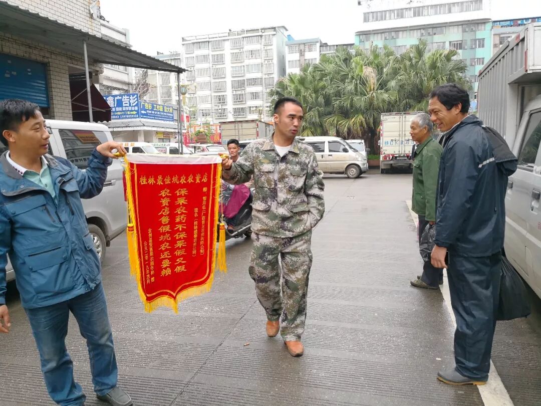 桂林也发生了给农资店送锦旗的情况。13日中午,全州农民熊冬林和同伴拿着“桂林最佳坑农农资店”的锦旗,来到灵川县八里街的桂北商贸城。