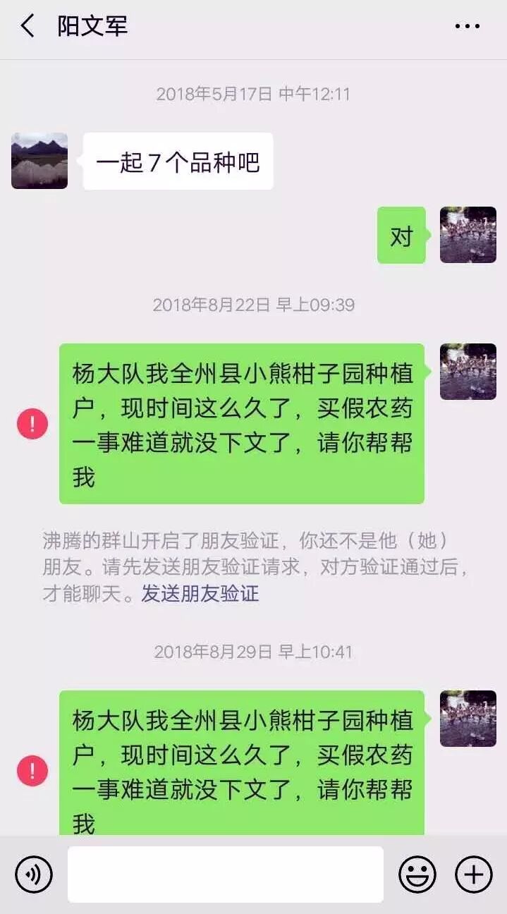 后来,熊冬林来到全州县农业执法大队投诉,得到答复是,因经销商在灵川,全州农业执法人员不能跨县调查,称已将投诉转给灵川农业执法大队。当天,他赶来灵川,途中联系灵川农业执法大队大队长阳文军。阳文军叫他不用来了,加微信发农药图片来就行,称过几天再去查。
