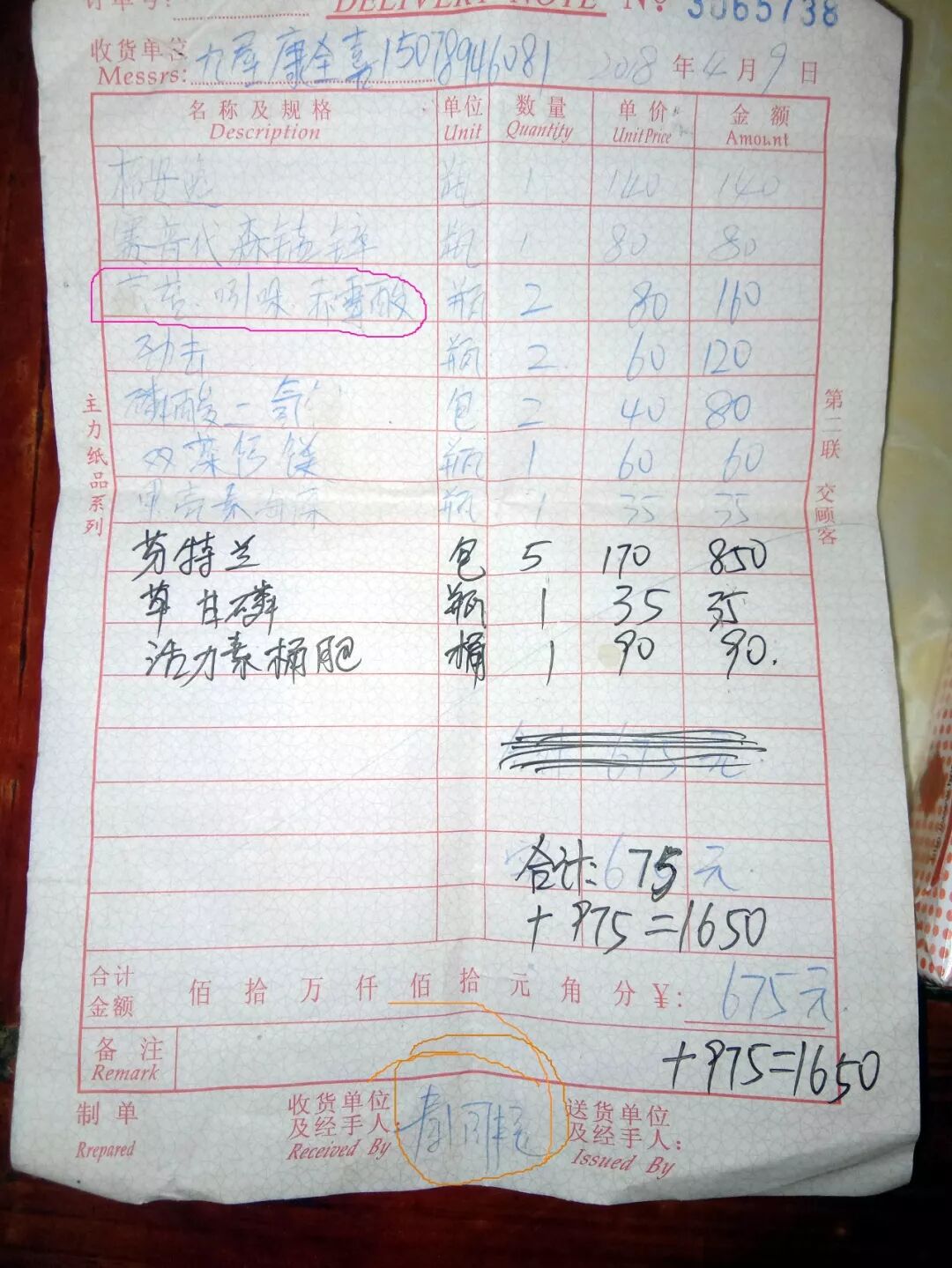 无独有偶,熊冬林在维权过程中,认识了灵川县九屋镇的农民康全喜,2018年4月9日,康全喜在广西青正农资公司买了一批农药,其中就有2瓶芸苔•吲哚•赤霉酸水剂,售货单经手上有秦国艳的名字。