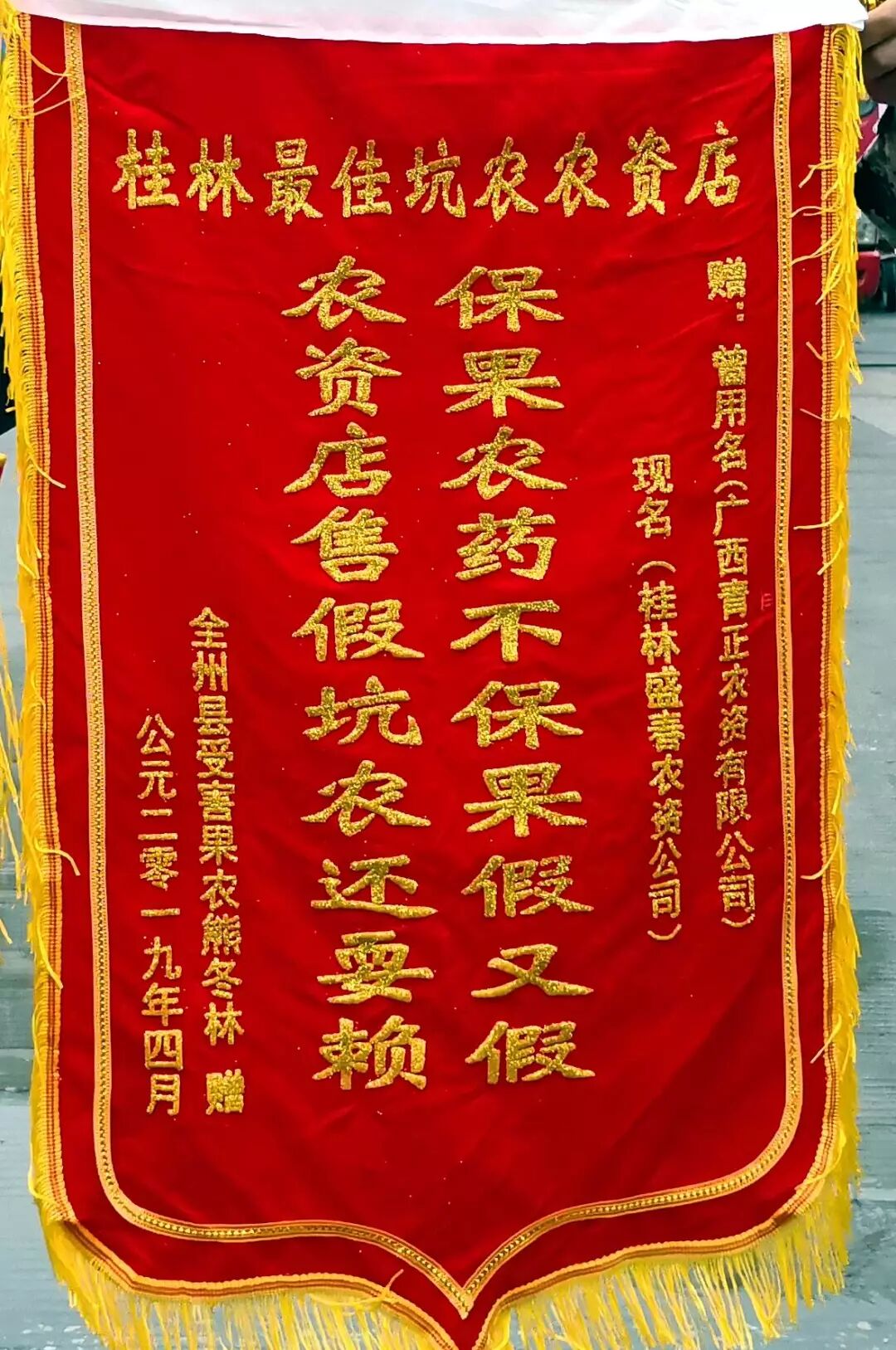 4月13日,桂林市灵川县八里街的桂北商贸城内发生一件奇事,一位自称全州受害果农的熊冬林给商贸城内的广西青正农资有限公司(现名桂林盛春农资)送了一面锦旗,写着“桂林最佳坑农农资店”。还给灵川县农业农村局送了一面“踢皮球先进单位”的锦旗。具体情况,详见下文。